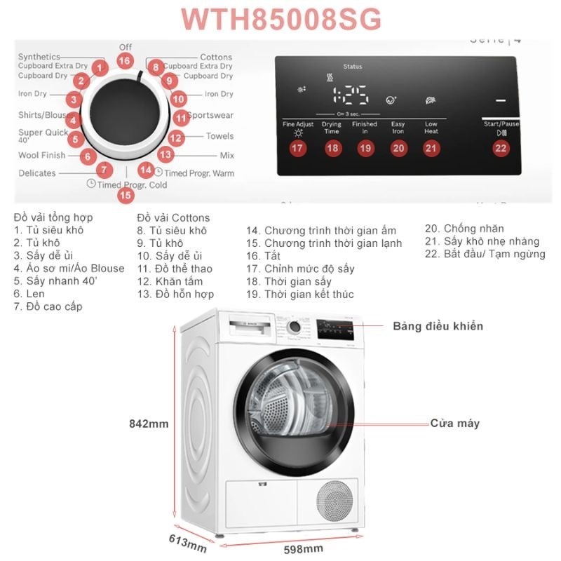 - 15 chương trình sấy tự động cùng 6 tùy chọn bổ sung: Đa dạng chế độ phù hợp mọi loại vải và nhu cầu.